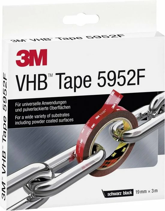 3M VHB 5952F Deze krachtige VHB-tape van 3M biedt een optimaal aanpassingsvermogen aan de te plakken oppervlakken. Dit kenmerk maakt het mogelijk om zowel dunne als gestructureerde oppervlakken over het hele vlak spanningsvrij te verbinden. Deze nieuwe generatie van flexibele, krachtige plakbanden onderscheidt zich verder door een goede slagvastheid bij temperaturen onder de 0 Β°C, een goede weekmakerbestendigheid en een zeer snelle hechting. Toepassing en: d e meeste oppervlakken met poedercoating, veel kunststoffen en zeer snelle hechting, hoogenergetische materialen en glas. Het gebruik van primer of het vooraf ruw maken van het vast te plakken oppervlak is niet nodig.