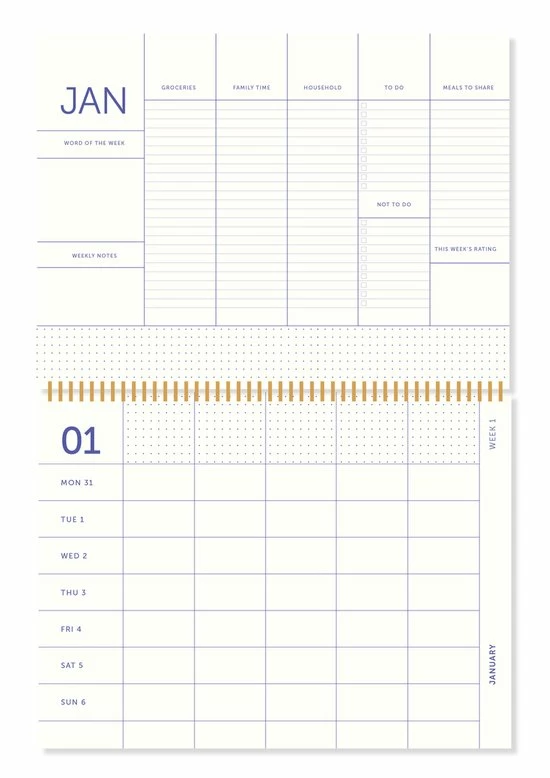 Zonder goede familieplanner kunnen we eigenlijk niet meer. Ons drukke bestaan vraagt om structuur. Dat geeft rust en houvast. Daarom hebben we de A-Journal familieplanner 2023 ontwikkeld. Een strak design, overzichtelijk weekoverzicht en heel veel lijstjes. Omdat ze je helpen georganiseerd te blijven en grip te houden op je leven zonder iets te vergeten. Zo is er ruimte voor to doβs, no to doβs, groceries, family time, weekly notes en natuurlijk: this weeks rating. In de planner is ruimte voor vijf familieleden, huisgenoten of collegaβs. Handig want juist door agendaβs te combineren krijg je meer tijd voor elkaar. Kortom, een must have voor iedereen die graag in controle is en tijd wil overhouden voor de leuke dingen in het leven.