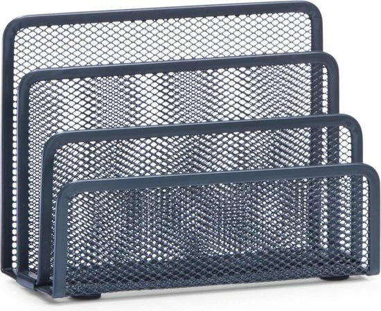 Een antraciet grijze bureau brievenhouder postbak om o.a. uw brieven, kaarten en post in te plaatsen en overzichtelijk te bewaren op kantoor of in uw hobbyruimte. De houder bevat 3 staande vakken. Afmeting: ca. 17 x 8 x 13,5 cm. Materiaal: gepoedercoat draadmetaal (mesh). U ontvangt 1 houder. Voor meer producten uit deze serie zoekt u op de term: meshantracietkantoor. Zeller – Kantoorbenodigdheden – Bureau-accessoires – Brievenhouders – Postbakjes – Mesh kantoor/bureau benodigdheden.