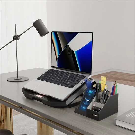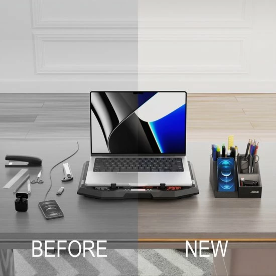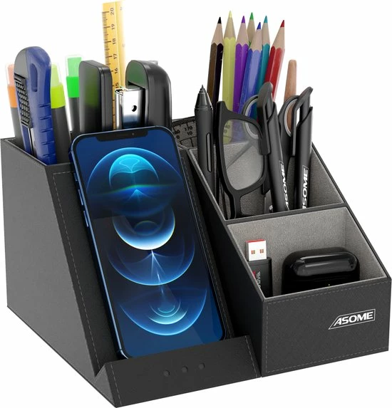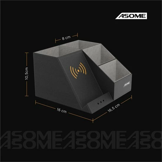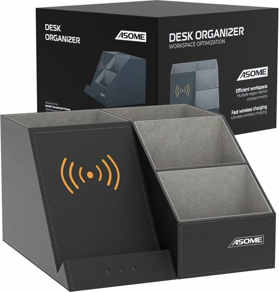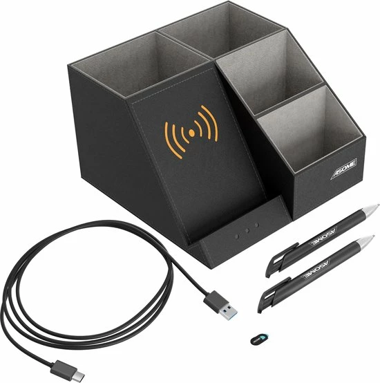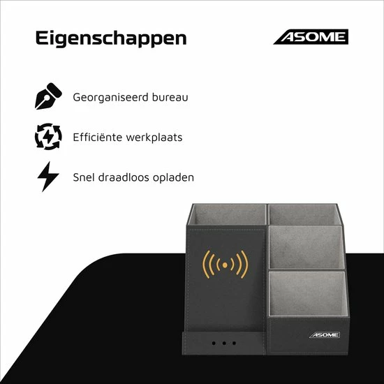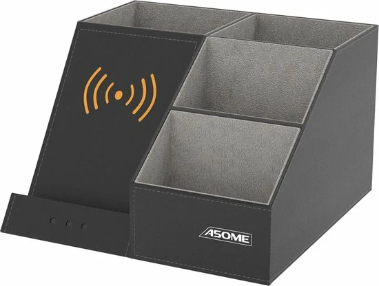 De pennenbak van Asome heeft 4 compartimenten met ruimte voor ruim 40 pennen en andere bureauaccessoires. Daarnaast beschikt de pennenbak over een draadloos oplaadstation geschikt voor zowel Android als IOS. Hierdoor heb jij minder last van draden die over je bureau lopen en word je dus minder snel afgeleid. Het stijlvolle zwarte design zorgt ervoor dat de pennenbak geschikt is voor elke werkplek van zowel man als vrouw.