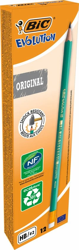 100% gemaakt in Frankrijk, van 56% gerecycled materiaal: dat is het recept voor het BIC Evolution Original gum vulpotlood. Sinds de lancering in 1993 is dit potlood een potlood als geen ander: het is het eerste houtvrije grafietpotlood gemaakt van kunsthars. Het unieke fabricageprocΓ©dΓ©, waarbij gebruik wordt gemaakt van een hoogtechnologische methode die quadri-extrusie wordt genoemd, biedt vele voordelen: weerstand tegen schokken en bijten, en geen splinters bij breuk. Jaren van onderzoek waren nodig om tot dit meer resistente en veiliger materiaal te komen. Het BIC Evolution grafietpotlood, nu klassiek in zijn groene kleur en met zijn rubberen punt, biedt alle voordelen van een HB potlood zonder de nadelen. BIC kwaliteit, om u te dienen.