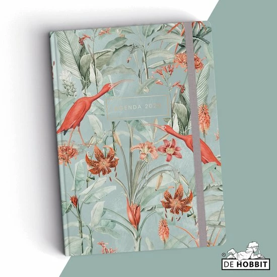 Mooie A5 agenda. De mintgroene achtergrond is voorzien van een dessin van ibissen en tropische bloemen. De tekst is uitgevoerd in goudfolie. Deze agenda heeft mooie afgeronde hoeken met een binnenwerk van crΓ¨mekleurig papier, wat zorgt voor een chique uitstraling. De agenda wordt gesloten door een grijsgroene elastieke band. Ook heeft deze agenda uiteraard een leeslint. De indeling van de agenda is één week over twee paginaβs in verticale kolommen. Deze agenda loopt van november 2022 t/m december 2023. * formaat cover: h:21,5cm x b:15,5cm * formaat binnenwerk: h:21cm x b:15cm * hardcover met goudfoliedruk, afgeronde hoeken * 144 paginaβs * luxe papier * weekoverzicht * elastieken band * leeslintje Nederlands.