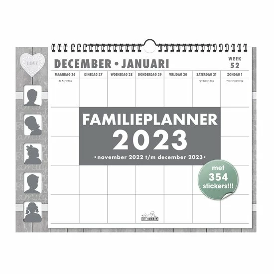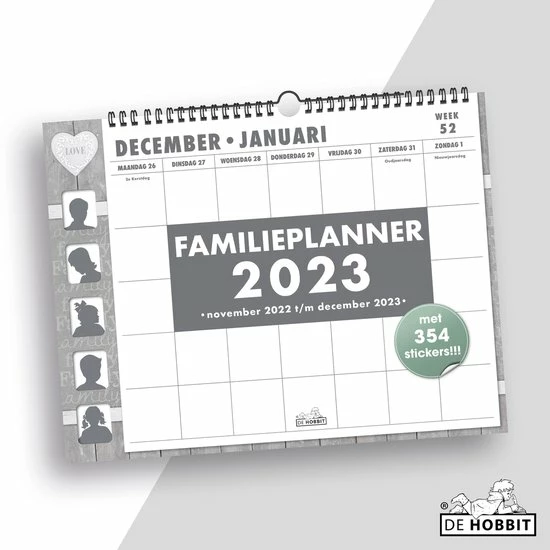 Grote 5 persoons omslag familieplanner met zwart spiraal. Het design van deze familieplanner is in ons βhome themaβ. Aan de linkerkant 5 handige insteekhoesjes voor pasfotoβs. De indeling van deze planner is één week op 1 pagina. De planner heeft een stevig kartonnen bord en is makkelijk op te hangen aan de metalen hanger. Als extraatje heeft deze familieplanner 354 super leuke stickers. Deze familieplanner loopt van november 2022 t/m december 2023.