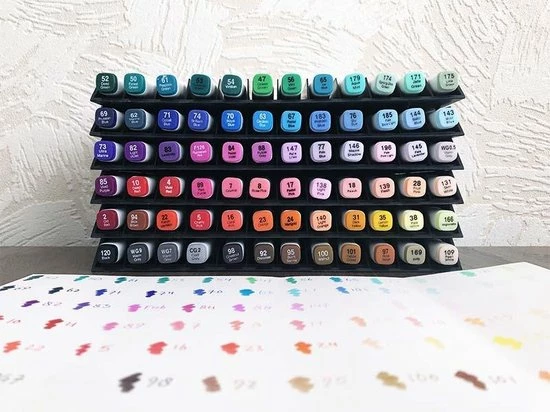 Deze professionele set wordt geleverd met handige stapelbare opberg box om alle kleuren op nummer in te verzamelen. De set is geschikt voor kleuren, kalligraferen, tekenen en handlettering. De set bestaat uit 72 markers in heldere en levendige kleuren.