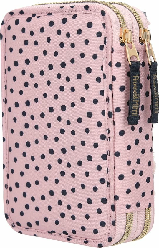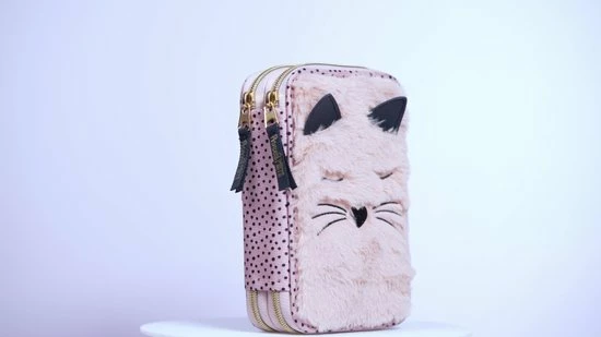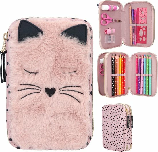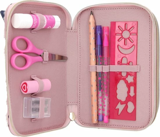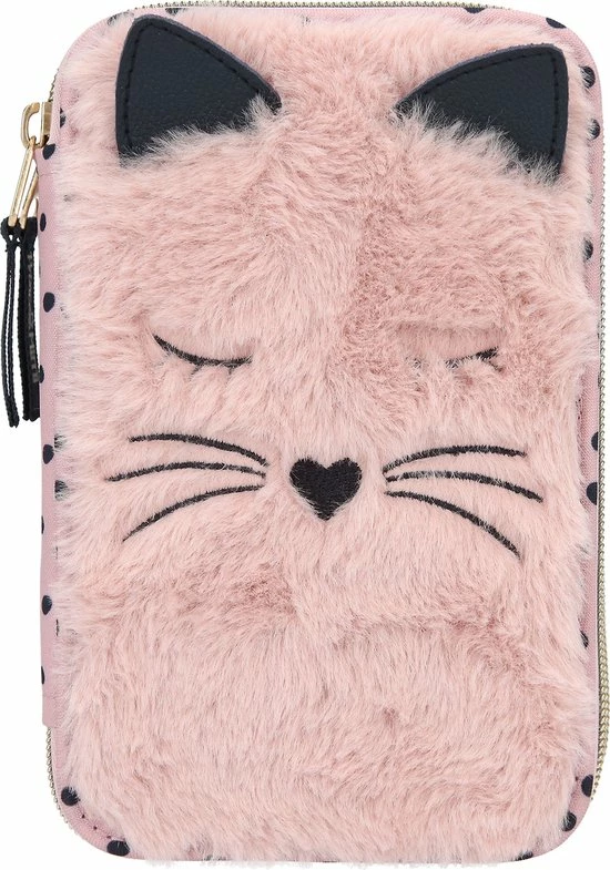 Super schattig en super zacht: de etui van Princess Mimi van roze pluche, zwarte oortjes en een geborduurd kattensnoetje heeft op de achterkant grappige stippen. De twee aparte vakken zijn compleet gevuld met een dik potlood, dubbele puntenslijper, een gum, liniaal (met sjablonen), schaar, plakstift, 12 dikke kleurpotloden en 2 glitter gelpennen. Materiaal: 100% polyester.