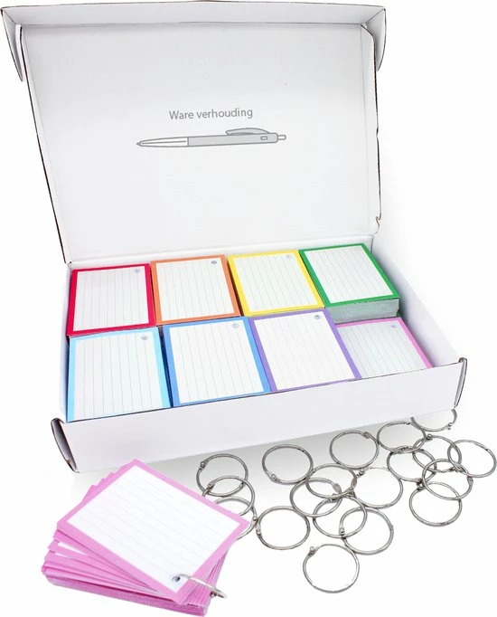 1000 stuks A7 Flashcards op extra stevig 300 grams karton. Deze kaartjes hebben een afmeting van 7.5 x 10.5 cm met perforatie gaatjes en 20 XL ringen. Onze Flashcards, ook wel Flitskaarten genoemd, zijn dubbelzijdig gelinieerd en worden geleverd in 8 heldere kleuren.