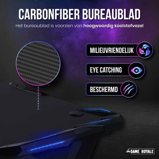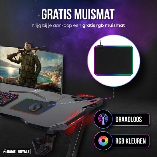 Het enige originele gaming bureau met dubbele led verlichting! Dit Game bureau van Game Royale inclusief gratis RGB-muismat is volledig geoptimaliseerd voor gamers. De gaming desk heeft een compact ontwerp en is daardoor geschikt voor grote- maar ook voor kleine ruimtes.