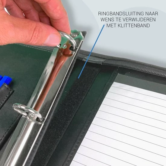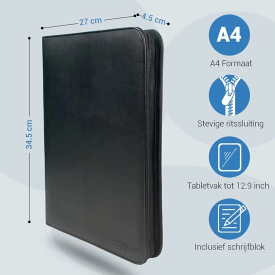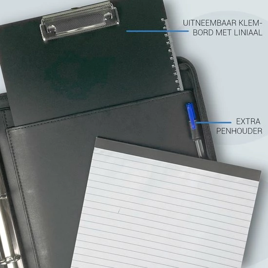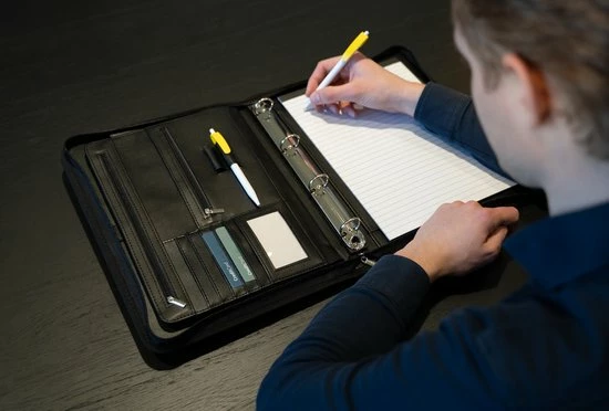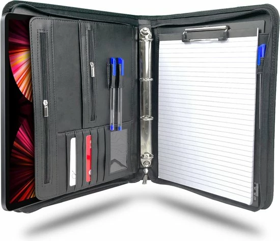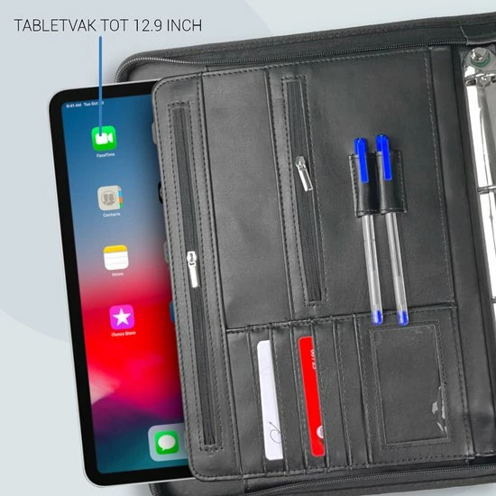Deze luxe schrijfmap geeft je direct een professionele uitstraling. Naast de uitstraling is het natuurlijk ook belangrijk dat je (huis)werk, notities, kaartjes en andere belangrijke documenten netjes geordend bewaard blijven. Met 6 kleine steekvakjes voor visitekaartjes, twee grote steekvakken voor A4 papieren, twee ritsvakken, 3 pennenhouders, een uitneembaar klembord met liniaal en een uitneembare ringbandsluiting heb je voldoende mogelijkheden papieren netjes te ordenen en bewaren. Daarnaast kun je jouw tablet tot 12.9 inch veilig opbergen in het gevoerde tabletvak en met klittenband afsluiten. De gehele schijfmap zit stevig afgesloten met een ritssluiting.