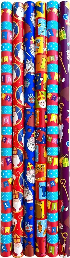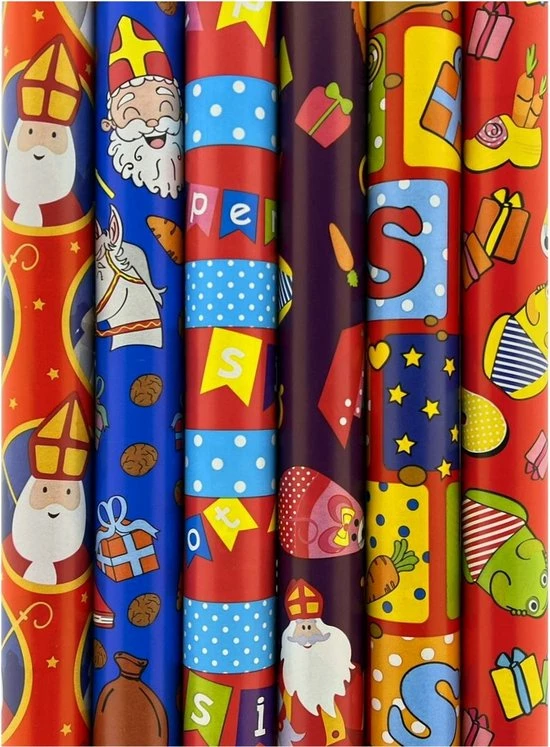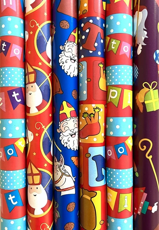 Pak al uw Sinterklaas cadeautjes in met dit vrolijke Assortiment cadeaupapier.