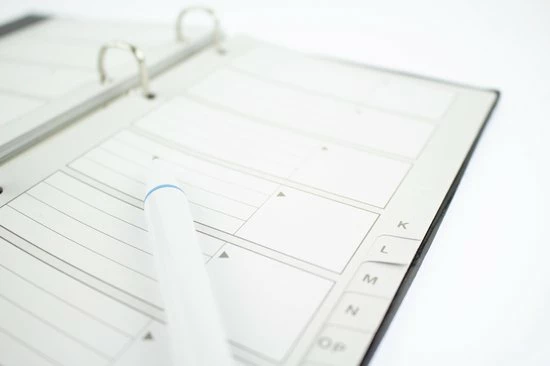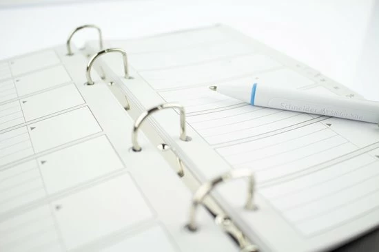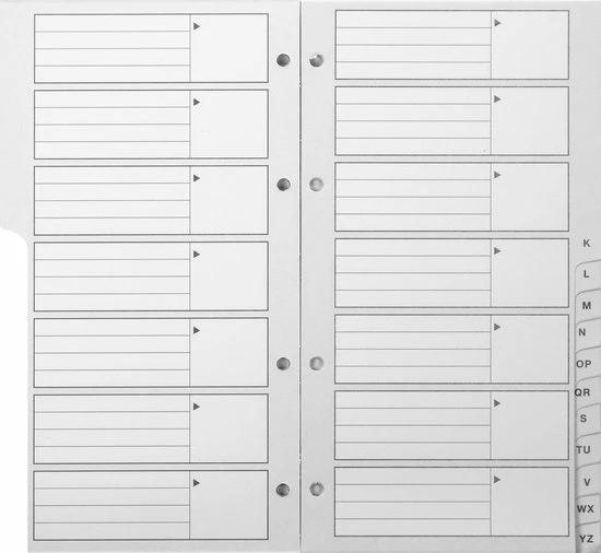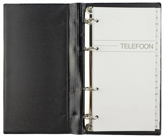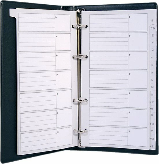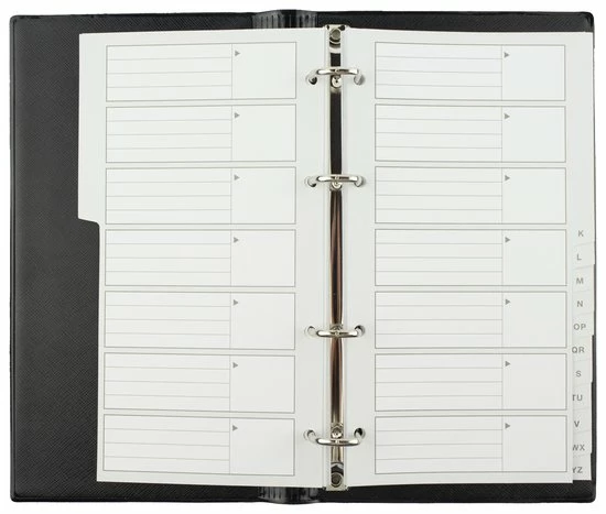 - In de ringband zit een alfabet A-Z, maar ook extra bladen en correctie-etiketten.