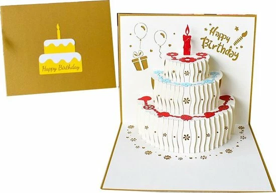 Wens hem/haar een fijne verjaardag met deze 3D pop up kaart! Als hij/zij de kaart opent, komt er een mooie taart tevoorschijn met eventueel ruimte voor een lief stukje tekst. De afmetingen van de kaart zijn 13×15.5 cm.