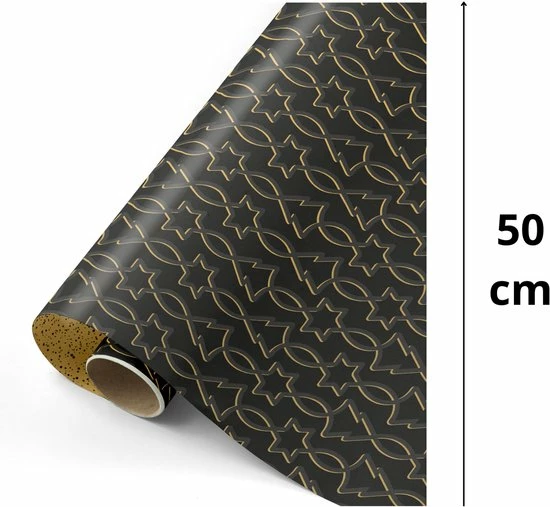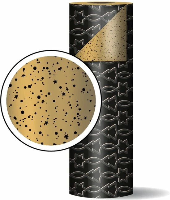 Met Kerst wil je natuurlijk de allermooiste ingepakte cadeautjes onder de boom leggen. Dit gouden met zwarte cadeaupapier met kerststerren en kerstbomen is perfect! Deze rollen inpakpapier zijn echt een prachtige kalme basis voor de kerst, waarop sticers en labels extra mooi uitkomen. De binnenzijde van dit papier is goud met zwarte glitters / sterren.