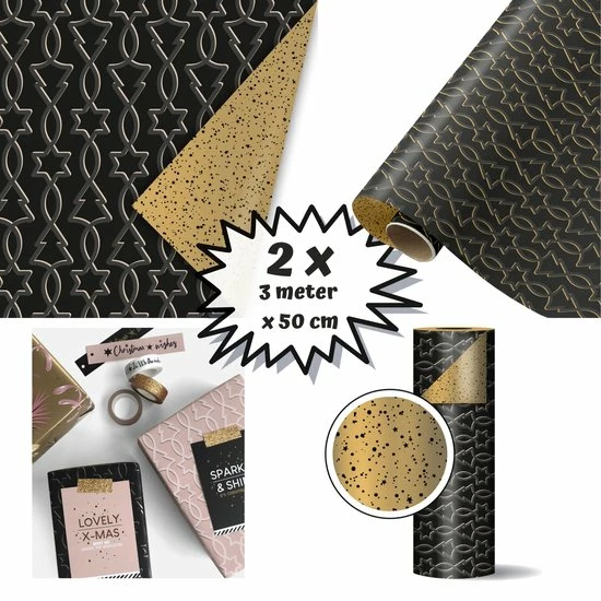 2 x Kerst Inpakpapier Rollen Cadeaupapier Goud Zwart