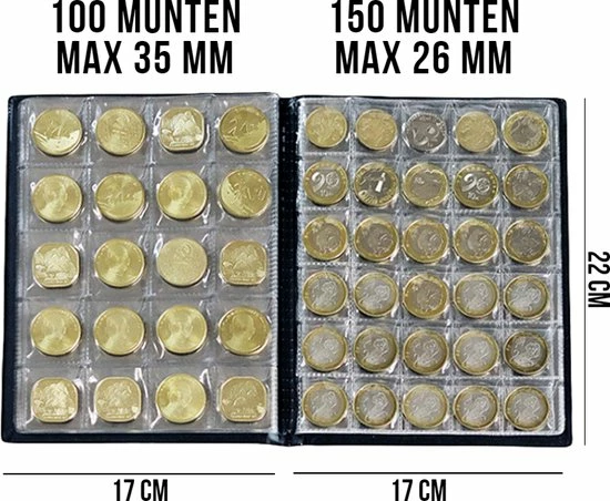 Een bijzonder handzaam Muntenalbum van 22 x 17 cm voor 150 munten met diameter tot 26 mm PLUS 100 munten met diameter tot 35 mm.