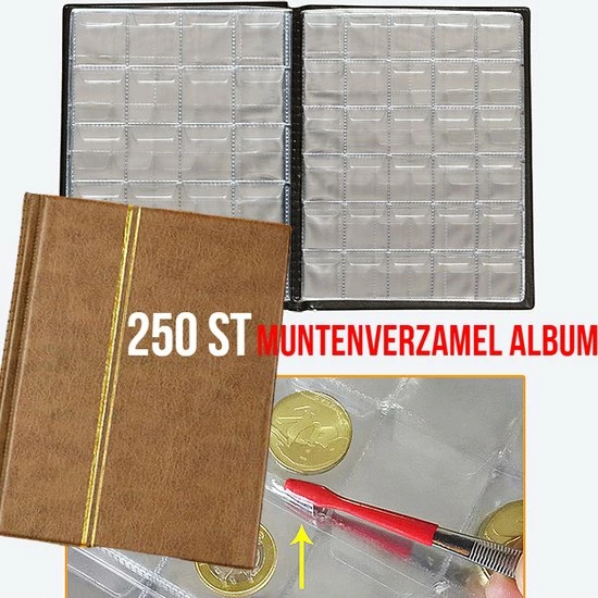 Allernieuwste Muntenalbum voor 250 Munten met Bescherm-rand tegen Uitvallen – Beginset Muntalbum – kleur Beige Bruin