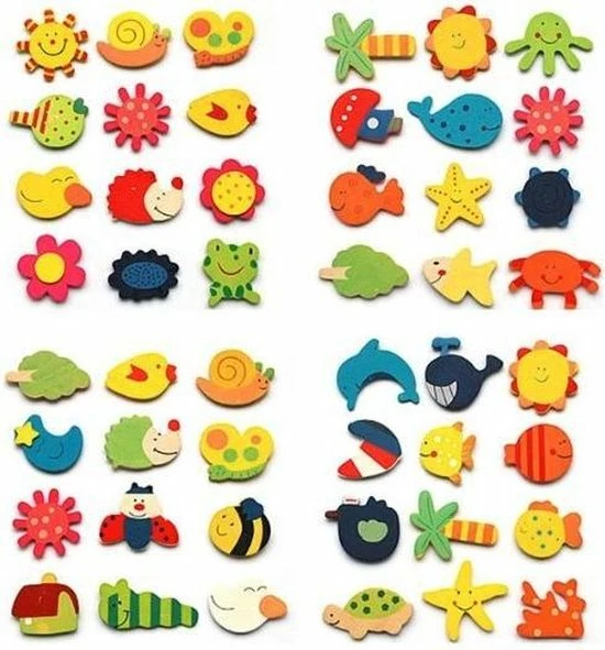 Houten magneten in vrolijke kleuren. Geschikt om mee te spelen op een whiteboard, koelkast, cv of een andere metalen ondergrond.
