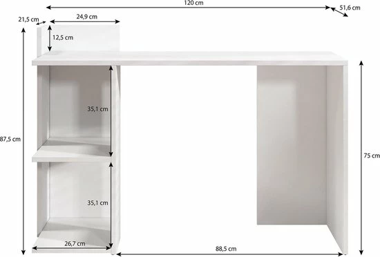 Het Pierre bureau met opbergvakken is een zeer multifunctioneel bureau! De combinatie van een breed werkblad met open schappen is erg handig om alles binnen handbereik te houden, maar toch op te kunnen bergen. Vanwege zijn afmetingen is het bureau in bijna elke ruimte te plaatsen: 120x51x87 cm.