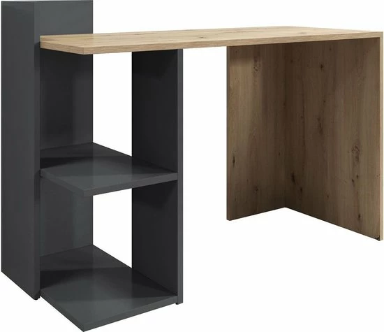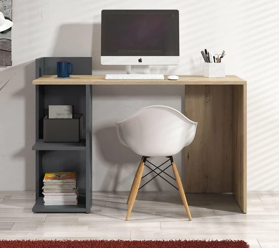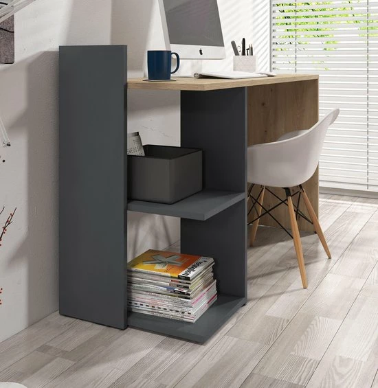 Het bureau is gemaakt van spaanplaat met een melamine coating in eiken en antraciet kleur. Het bureaublad is vervaardigd van thermisch gevormd MDF. Het bureau wordt geleverd in dozen met alle benodigde bevestigingsmaterialen en een duidelijke handleiding voor eenvoudige montage.