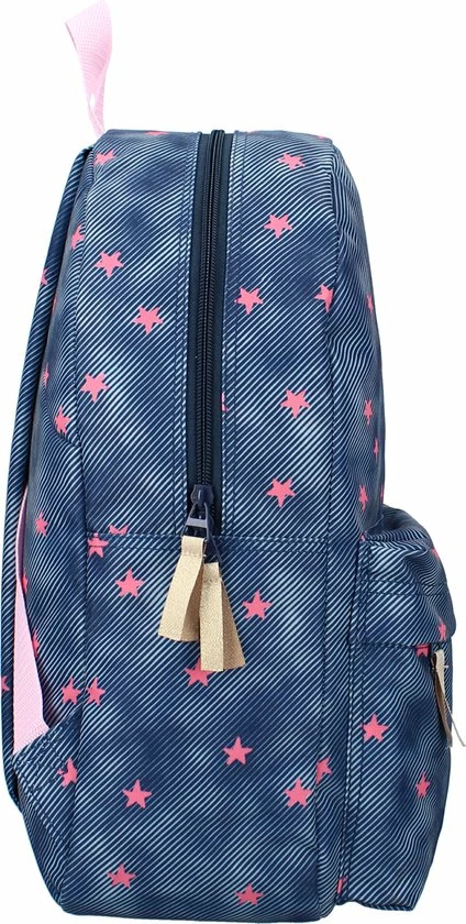 Deze hippe rugzak met sterren is een echte musthave voor elke jonge meid. Deze Milky Kiss tas uit de Rise and Shine collectie is donkerblauw met roze sterretjes. De rugzak heeft een ruim afsluitbaar hoofdvak waarin je al je spullen kwijt kan. De voorzijde van de tas is voorzien van een handig voorvakje met ritssluiting. Neem de tas mee naar school of een dagje weg. Verder kan de rugzak makkelijk opgehangen worden met de ophang lus. De comfortabele schouderbanden zijn in lengte verstelbaar, dus deze rugzak kan een lange tijd gebruikt worden.