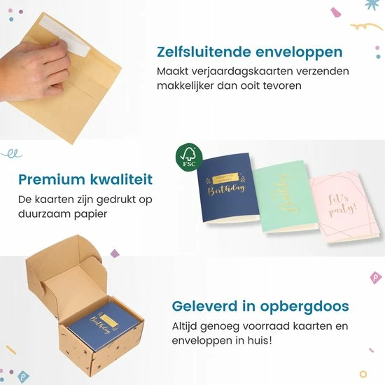 Met de Partizzle® verjaardagskaarten set zorg je ervoor dat je altijd kaarten met envelop bij de hand hebt.