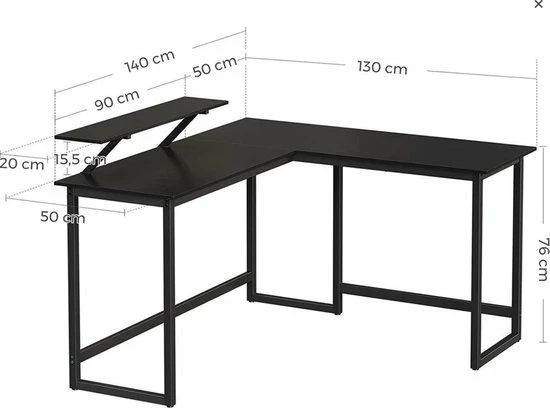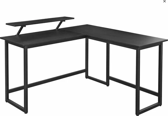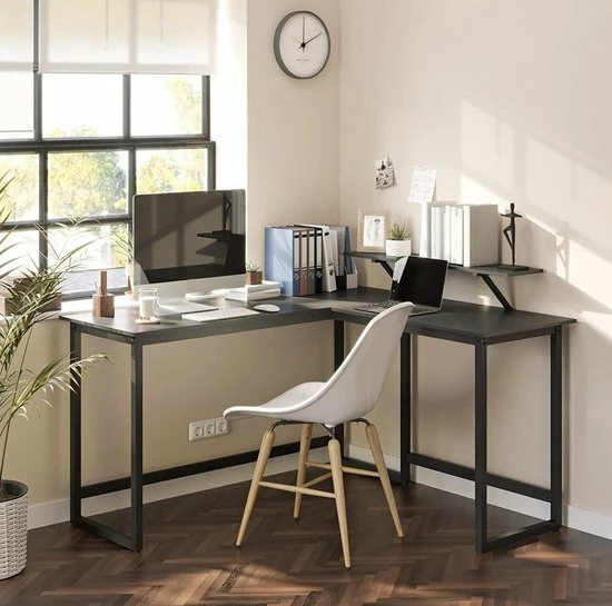Deze L-vormige computertafel combineert een stevig metalen frame met een aantrekkelijk vintage-look tafelblad. Hartstikke veel ruimte voor al je benodigdheden voor tijdens het werken of studeren.
