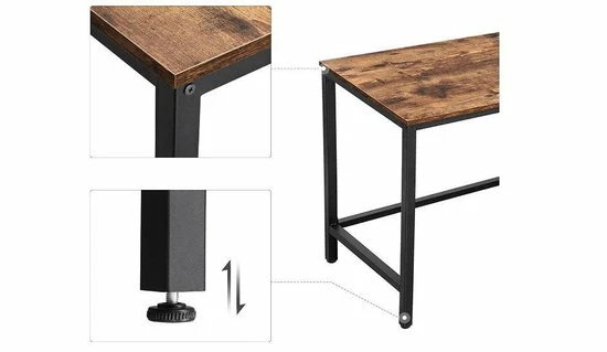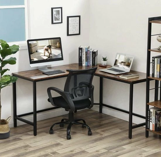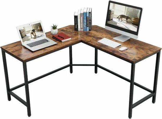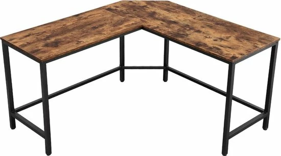 Deze L-vormige computertafel combineert een stevig metalen frame met een aantrekkelijk tafelblad in een vintage jasje, dat een unieke toevoeging zal zijn aan verschillende kamers in je huis.