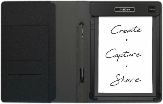 Het traditionele notitieblok gaat digitaal. Leg uw notities, ideeΓ«n of schetsen vast op het digitale notitieblok en deel direct met collegaβs, vrienden of klanten via de app. Dankzij de combinatie van de drukgevoelige pen met Royoleβs Flexibele Sensor in het pad, registreert RoWrite uw meest subtiele pennenstreek. Het toestel wordt geleverd met een inktpen, dus u schrijft met een normale pen op normaal papier: een gevoel dat niet gekopieerd kan worden door wat voor tablet of technologie dan ook. Handgeschreven notities en schetsen worden bewaard op het interne geheugen terwijl u ze maakt, om te bewerken of te delen wanneer u verbonden bent met de app. Om paginaβs te bewerken, koppelt u het digitale notitieblok eenvoudig met de RoWrite app. Met de app kunt u bewerken, markeren, kleuren gebruiken en er zelfs achteraf een video van maken. U kunt kiezen uit verschillende schrijfinstrumenten, de dikte van de lijn aanpassen, wissen of tot 20 kleuren toevoegen. RoWrite herkent bovendien uw handschrift en kan uw geschreven notities snel omzetten in tekstdocumenten. Het is mogelijk om uw notities en ideeΓ«n in real-time te bewerken wanneer u met de app verbonden bent. En u kunt de sequentie van uw pennenstreken vastleggen met de coole videofunctionaliteit, waarmee het mogelijk is om af te spelen in de app of op te slaan als MP4. Wanneer u klaar bent, kunt u de paginaβs met uw notities en ideeΓ«n direct vanuit de app delen via WhatsApp, email, de cloud of social media. RoWrite wordt geleverd met een elegante en functionele folio, die er niet alleen mooi uitziet, maar ook bescherming biedt. De oplaadbare batterij gaat tot acht uur mee.