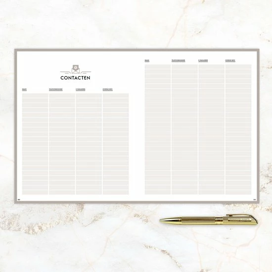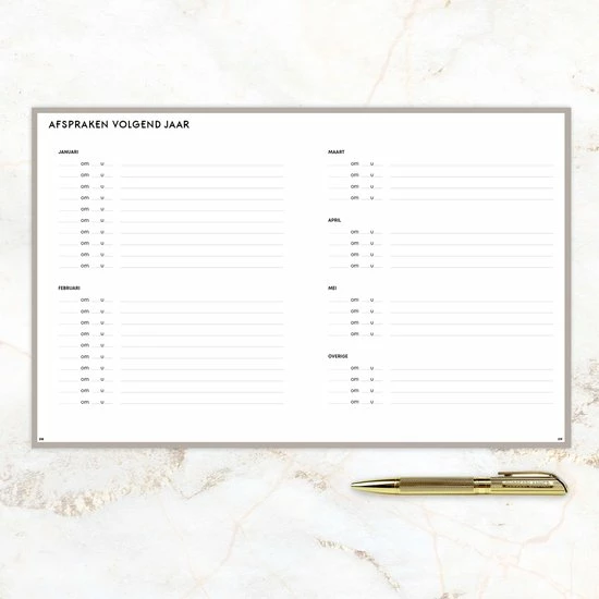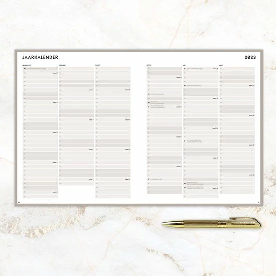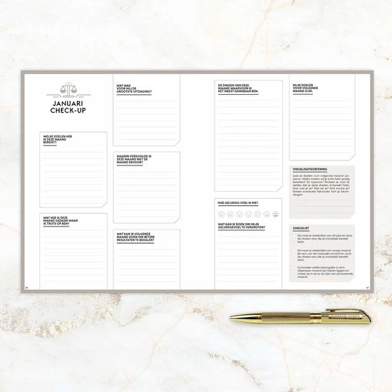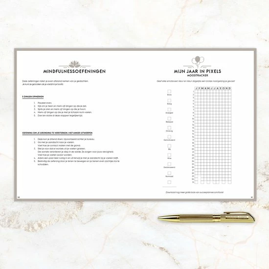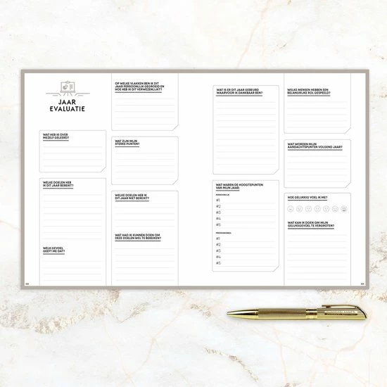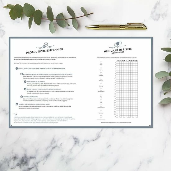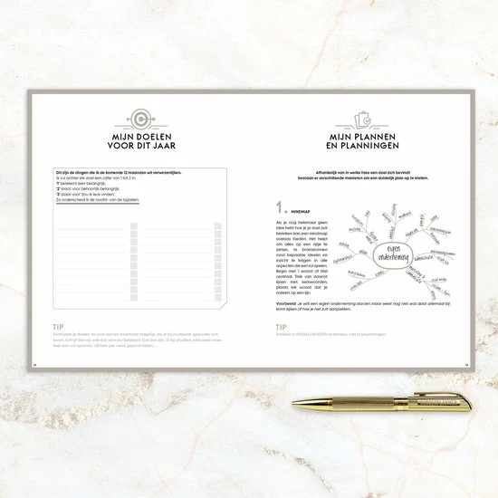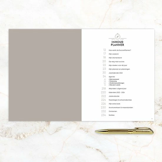 jaaroverzicht met notitieruimte • mijn doelenlijst voor komend jaar • mijn plannen en planningen • maandelijkse reflectievragen • levenswiel • notitieruimte na elke maand • overzicht van maanstanden • nieuwe dossiers rond timeboxing en met mindfulnessoefeningen