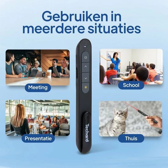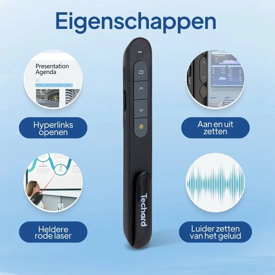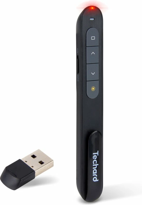 Jouw presentaties extra ondersteunen met behulp van een presenter? De Techard pointer helpt jou hierbij! Door de krachtige laser en het lichte gewicht wijs jij de belangrijke punten moeiteloos aan. De draadloze aanwijzer is Plug & Play dit betekent dat jij direct kan presenteren en er geen software nodig is!