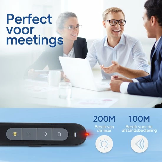 Door de ingebouwde 2.4Ghz adapter heeft de pointer een bereik van wel 200 meter! Vooral bij het presenteren in grote zalen is dit een nuttige functie. Zo kan jij jezelf onder het publiek bevinden terwijl jij belangrijke punten aanwijst. Via de bovenste knop opent u gemakkelijk een hyperlink of video. Het geluidsniveau is gemakkelijk aan te passen doormiddel van de knop aan de rechter zijde van de presenter. Alles is dus te bedienen vanaf 1 apperaat.