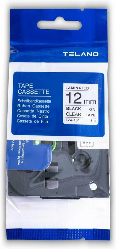 Deze tape heeft een breedte van 12 mm en een lengte van 8 meter. De TELANO lettertape TZe-231 heeft een zwarte bedrukking op een transparante gelamineerde tape.