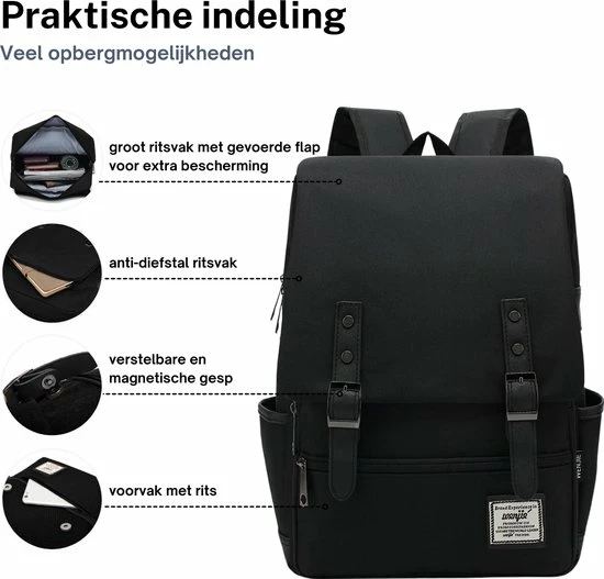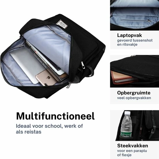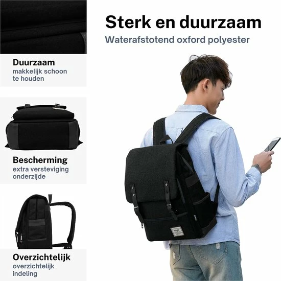 De tas is geschikt voor dames en heren (unisex) en heeft veel opbergmogelijkheden. Zo is deze rugtas voorzien van drie ritsvakken. Het kleine ritsvak aan de voorzijde gebruik je om kleine spullen in op te bergen zoals pennen, sleutels of je telefoon. Aan beide zijkanten van de tas is een steekvak voor het bewaren van een waterflesje of paraplu.